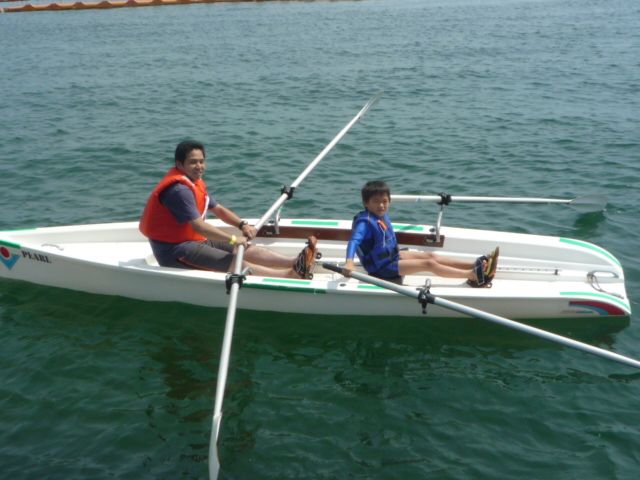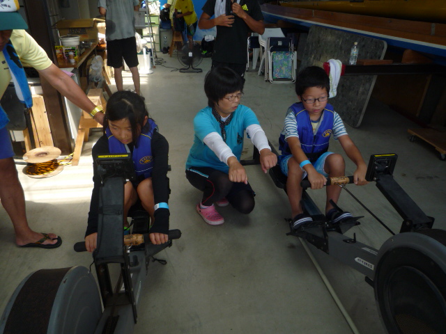 本格的な競技用ボートナックルと親子2人で乗れるオーシャンスカルを用意し、最初のローイングの練習をして、その後実施体験を行いました。