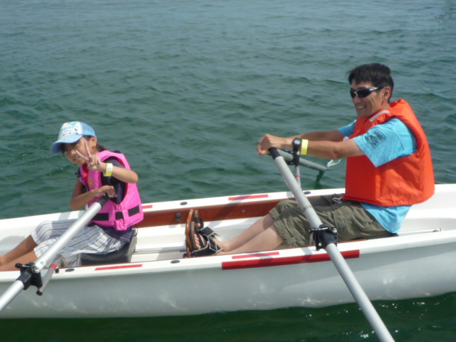 ナックルは前後にインストラクターがついて実施しましたが、みんなでオールを動かす動作を一致させると、水面をすべるように推進してゆき、体験者はその速さに夢中になっていました。2人乗りのオーシャンスカルは親子のんびりと海でのボートを楽しんでいただきました。