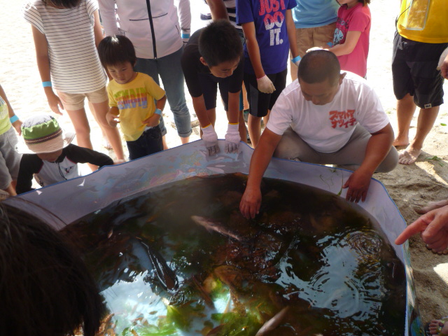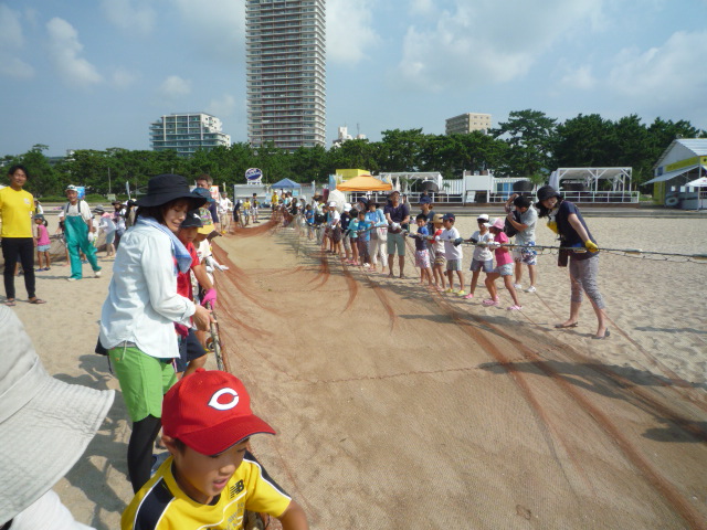 普段なかなかかかわることが無い漁師さんの指示のもと地引き網を引き上げ、取れた魚を見て触れて楽しんでもらいました。みんなで声を合わせて網を引く一体感や、最後は持って帰ることができることもあり、親子共々盛り上がりました。