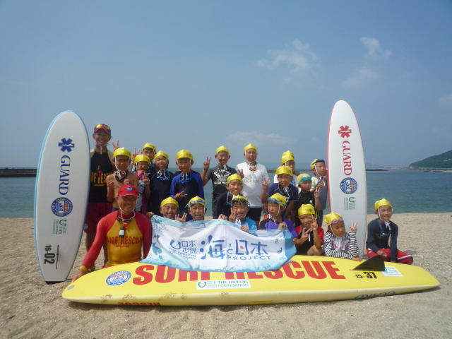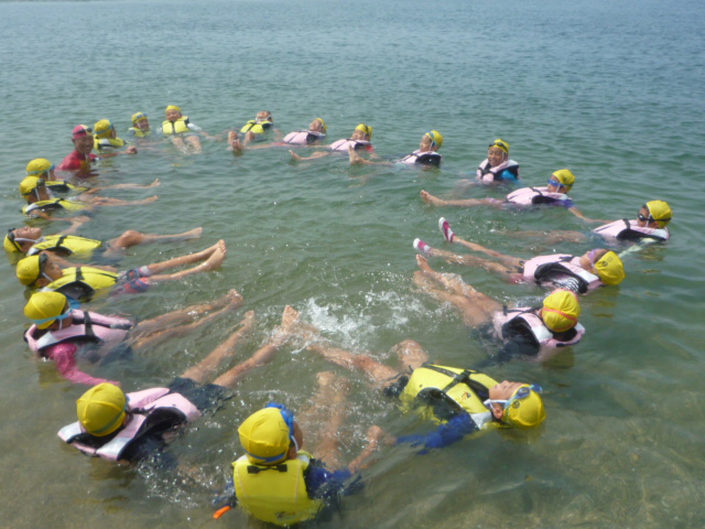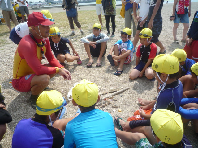 ライフセービング体験では実際のライフセーバーの先生から海辺での走り方や泳ぎ方、救助アイテムを使った救助方法など、海の大切さやこわさを教えていただきました。