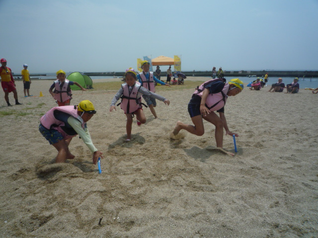 子どもたち全員がライフセービング帽を被り、ボードを使った救助を想定したレースが行なわれ、子どもたちが「レスキュー!」と叫びながら海へ入っていく姿は、まさにライフセーバーそのものでした。ビーチフラッグス対決はグループトーナメント方式で対決。保護者も一緒に応援し、とても盛り上がりました。