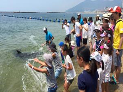 ドルフィンコーストプロジェクトでは、須磨海水浴場の海に浅瀬でイルカを観察しながらドルフィントレーナーの方よりレクチャーを行なっていただいた。