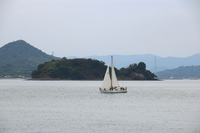 サンセットビーチ南側の港から沖に浮かぶひょうたん島を周回する、約1時間のヨットの乗船体験を行いました。