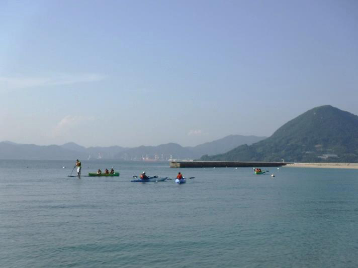 受付テントおよび指導場所は、海水浴客との混雑を避けるため、ビーチ北側に設置。参加者は、インストラクターからパドルの扱い方やカヤックの進め方について指導を受けた後、湾内に漕ぎだし、思い思いにカヤックを楽しみました。