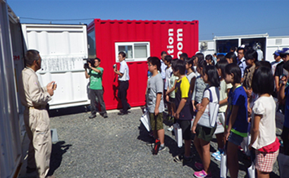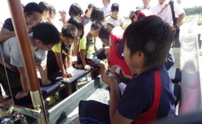 ・日本初の燃料電池船試乗です。燃料電池船に乗った小学生は「君たちが日本で初めて」という説明を受けてみんな大興奮。
