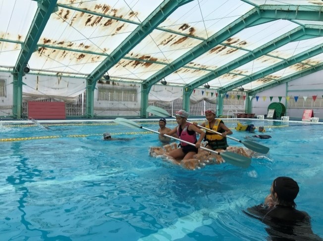 「タイム部門」「バランス部門」「デザイン部門」の3部門を設けて実施。タイム部門はプールのみの参加で、制作したいかだにて25mプールの往復タイムを競いました。また、バランス部門は指定のいかだに乗ることができたタイムを競いました。デザイン部門は制作したいかだ・カヌーを審査し、各部門ごとに優秀な成績をおさめた海洋センター・クラブを表彰する内容として実施しました。