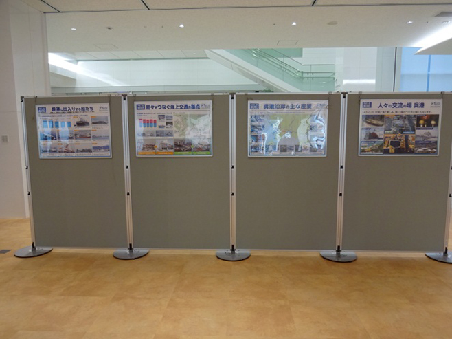 呉の戦前の飛躍的な発展や戦後の臨海工業貿易港への転換の歴史、呉港区、広港区の特徴の紹介、呉港に出入りしている船の種類や貨物量、海上交通フェリーや旅客船航路などを8枚の啓発パネルにして展示しました。