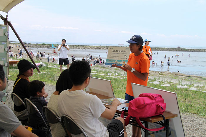 東京会場である葛西海浜公園では、当日は天候に恵まれ、子どもたちだけでなく大人も合わせて47人が参加しました。ペットボトル浮きだけでなく、もし不意に水に落ちてしまったときの対応などを伝える安全紙芝居やライフジャケットの体験イベントも合わせて実施し、水の事故への理解を深めてもらうことができました。