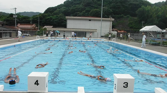 兵庫県宍粟市の会場では、海洋センタープールの改修工事が終了し、お披露目式典の後に行われ、シドニー五輪競泳銀メダリスト中村真衣さんが応援に駆け付けました。子どもたちは一生懸命ペットボトル浮きをして、楽しく水の安全について学びながら、記録に挑戦しました。