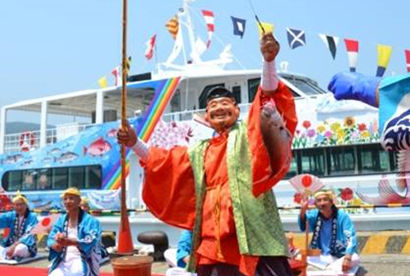 8月2日、海でつながる未来と海峡フェスティバル、明石海峡新船舶「まりん・あわじ」就航記念式典が兵庫県淡路市の岩屋港で開催されました。第一幕は午前10時3分、花火の合図とともに、地元AIE国際高等学校の学生による和太鼓の演奏で幕が開かれると、淡路島岩屋漁業協同組合の大漁旗を掲げた漁船に先導され、新船舶「まりん・あわじ」が、ご当地キャラクターの「あわ神」、「あわ姫」や「はばタン」などを乗せ、船体には明石海峡で獲れるタコやタイを描いた「まりん・あわじ」が訪れた約700名の人々の前に姿を現しました。