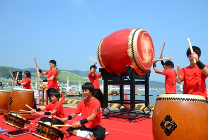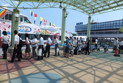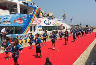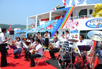 第2幕はステージセレモニーで「まりん・あわじ」を背にした舞台で就航を祝います。トップバッターはAIE国際高等学校の迫力満点の和太鼓です。続いて、多くの学生が「まりん・あわじ」で通学することになる、地元淡路高校と淡路吹奏楽団が合同で吹奏楽を披露、市立岩屋保育所及び市立石屋小学校附属幼稚園児によるかわいい踊りは会場を和ませました。ステージセレモニーのトリを飾るのは、岩屋恵比須舞奉賛会のみなさまによる恵比須舞で、コミカル舞で観客を沸かせました。