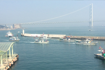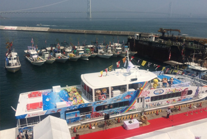 8月2日、海でつながる未来と海峡フェスティバル、明石海峡新船舶「まりん・あわじ」就航記念式典が兵庫県淡路市の岩屋港で開催されました。第一幕は午前10時3分、花火の合図とともに、地元AIE国際高等学校の学生による和太鼓の演奏で幕が開かれると、淡路島岩屋漁業協同組合の大漁旗を掲げた漁船に先導され、新船舶「まりん・あわじ」が、ご当地キャラクターの「あわ神」、「あわ姫」や「はばタン」などを乗せ、船体には明石海峡で獲れるタコやタイを描いた「まりん・あわじ」が訪れた約700名の人々の前に姿を現しました。
