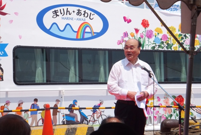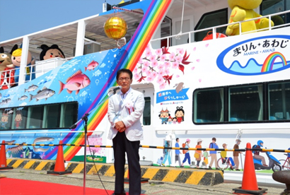 式典で、門康彦淡路市長は、これまでに新船舶の建造にご支援、ご協力をいただいた方々や、盛大な就航式典にご支援いただきました日本財団様へ感謝申し上げた後、「明石海峡航路は、淡路島の重要な交通手段であると考えている。これで有事の際の海上交通の確保ができた。今後は淡路島と本土との交流がますます盛んになれば」とあいさつしました。