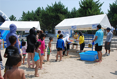 本事業は、林崎・松江海水浴場において、海水浴等に訪れた方々、特に家族連れのお子様を対象に、海や水を使った遊びを体験してもらうことで海に親しんでいただくとともに、明石の海の素晴らしをPRしようと実施したものです。