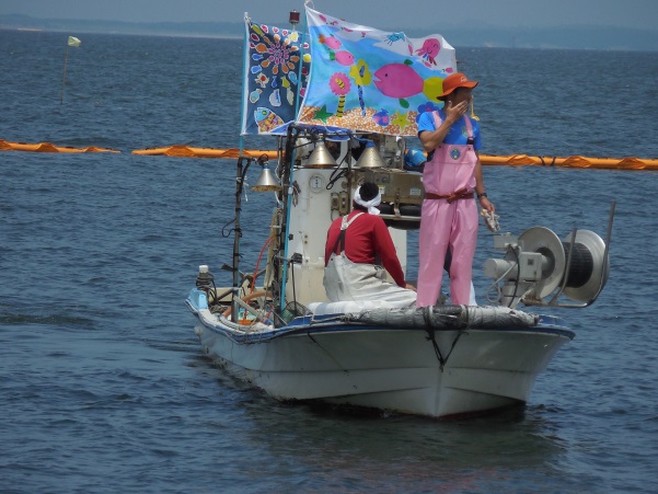 7月17日(日)には、制作した大漁旗をはためかせた船が出航しました。漁師と一緒に地引き網漁を体験しました。