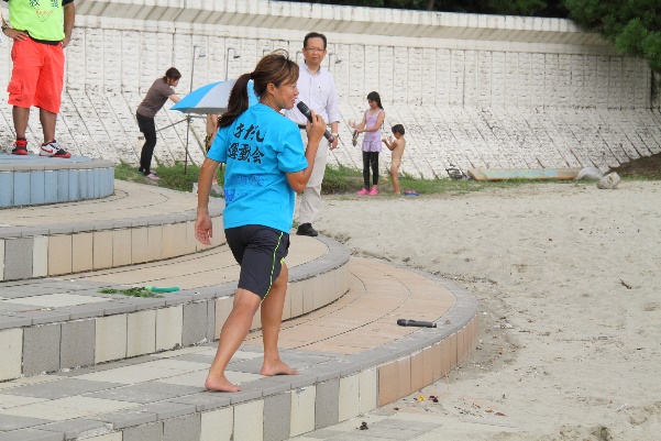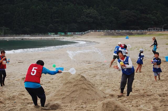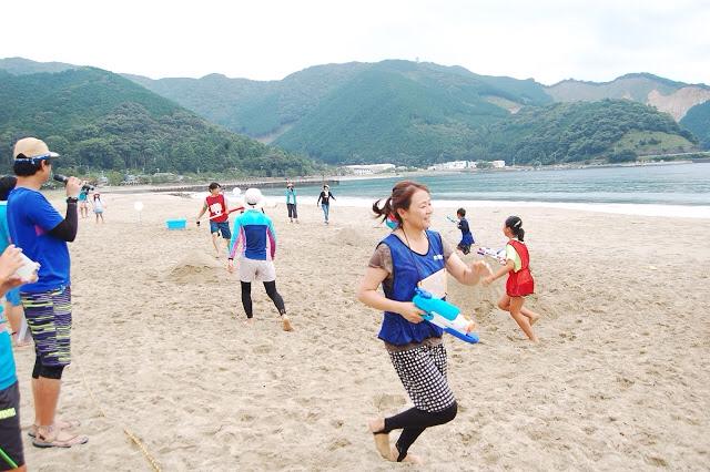 尾鷲市教育委員会のバックアップのもと、地元の子育て支援サークルや婦人会等にもご尽力いただき、地元一丸となってのイベントでした。前回同様、NPO法人イクメンクラブの長谷川代表やNPO法人日本ビーチ文化振興協会の遊佐副理事長による開会式を終えると、競技スタートです。