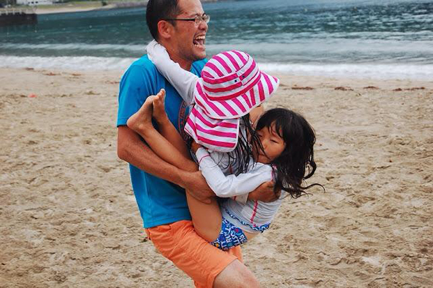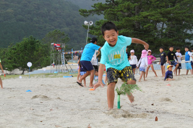 尾鷲名産のヒノキを使い「家族対抗“ヒノキ争奪”ビーチフラッグス」となりました。途中小雨がパラつきましたが、気温も高く問題にはなりませんでした。さらに恒例のパパとママのおんぶ徒競走は今回も白熱!夫婦、親子でキスをすると追加得点がもらえるということで大いに盛り上がり、ビーチは家族愛にあふれました。