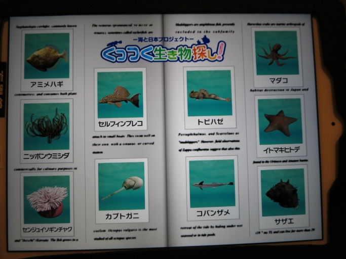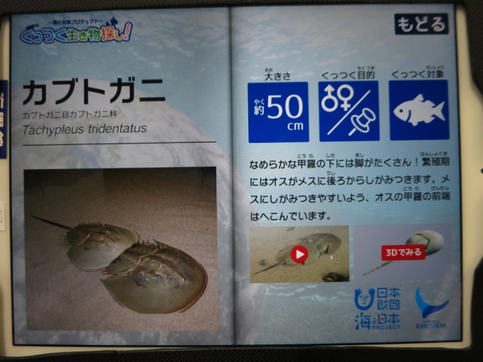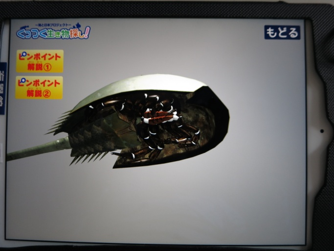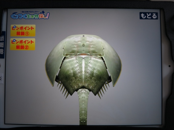 館内10か所に「iBeacon」を設置し、そのセンサー内にインストールしたタブレット端末が入ると、その生き物の情報がタブレット端末に届きます。実際に水槽を見ていても見ることの少ない行動の動画や、3D画像を用いて、くっついていると確認できない内側を見ることができます。一度届いた生き物の情報は館外でも確認できます。