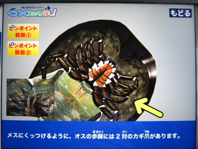 「何に、どうやって、なぜくっつくのか」という観点で、くっつく海の生き者の形態や生態、他種を含めた環境との関係を動画や3D映像を駆使して解説し、海の世界を学んでもらう。