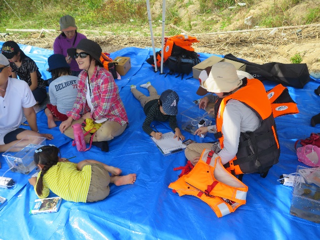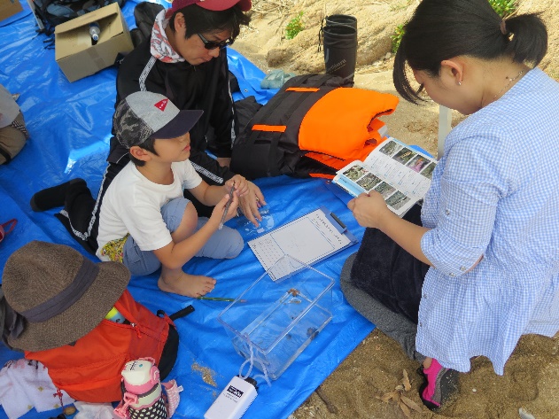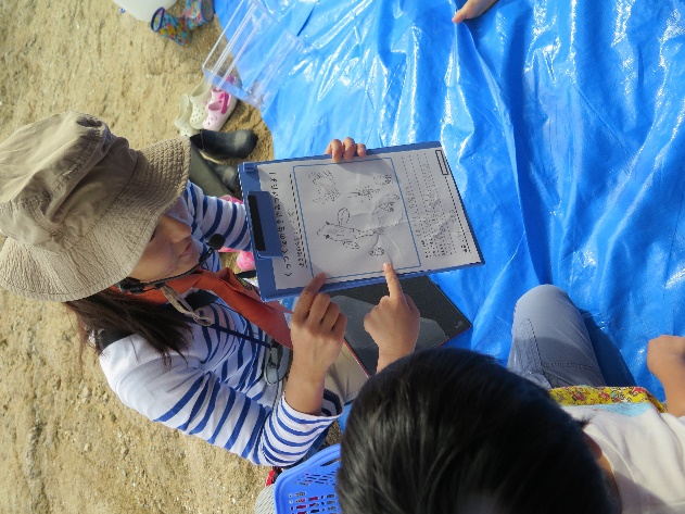 まずは磯にいる生き物を自身の知識、技術で探してもらいました。そのあと、スタッフが助言した上で、再度生き物探しをしました。その後、種名を調べたり、実際に自分が採集した生き物を細かな特徴を観察しながらスケッチして、みんなの前で発表しました。