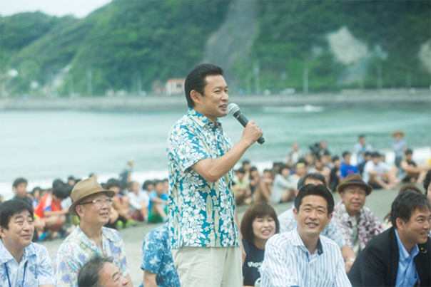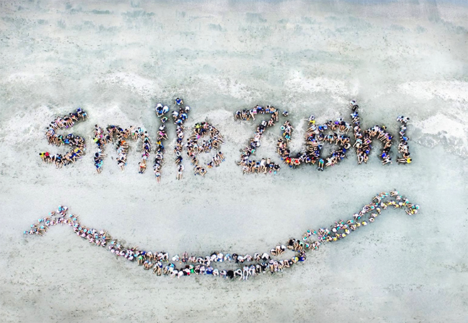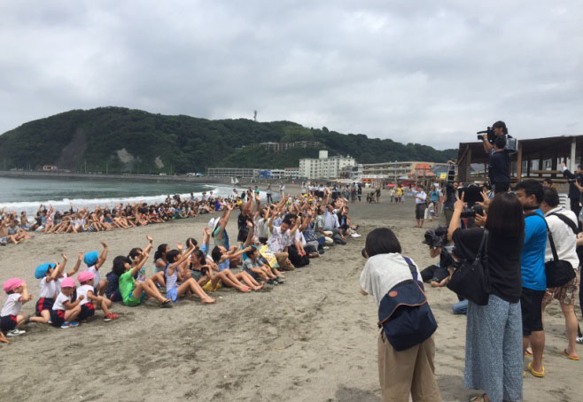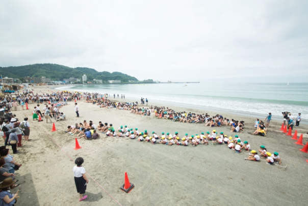 地域の小学生、幼稚園児を中心に、海開き式に参加した一般参加者、関係者(海岸組合、県議、市議、その他来賓)を含めた約450人で、「Smile Zushi」の人文字を作り、ドローンで上空から撮影しました。