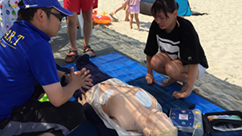 心臓マッサージやAEDの使用方法など心肺蘇生術の他、救助ボードの取り扱いや溺れている人がいないか監視する技術について、ライフセーバーから直接指導していただきました。