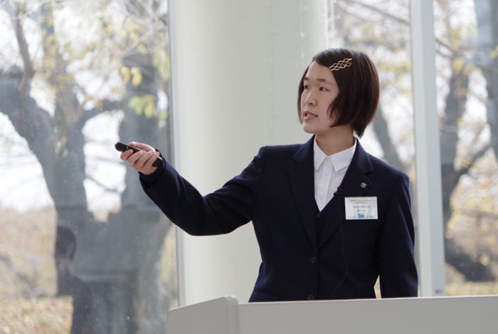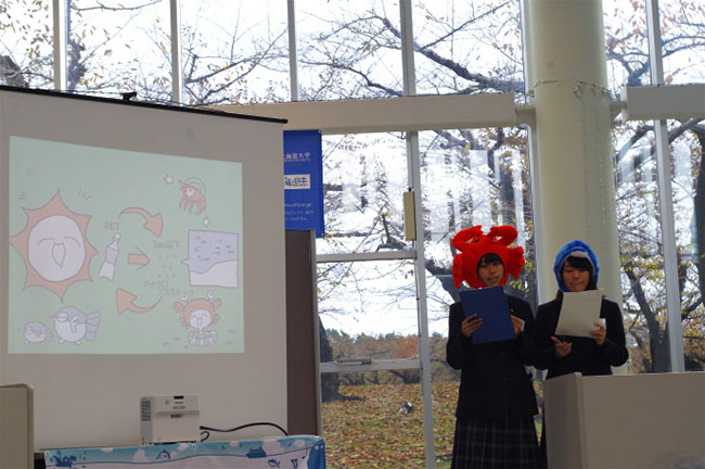 このコンテストは、自分にとって海の宝と思える題材を見つけ、パワーポイントなどのソフトを使って8枚の“電子紙芝居”でアカデミックに表現するというもの。コンテストの募集対象は中学生と高校生です。7月19日から9月30日までの約2か月半の応募期間中に全国から68点の応募があり、中学生部門6作品、高校生部門11作品の計17作品が1次審査を通過。そして11月13日、五稜郭公園に隣接する五稜郭タワー1階アトリウムで努力の成果を披露しました。