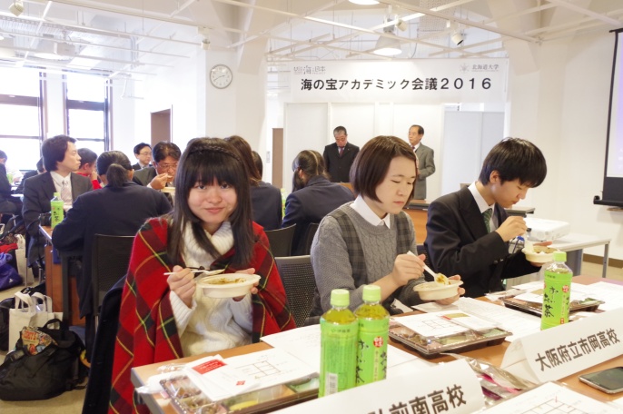 今年、初めての開催となる「海の宝アカデミックコンテスト2016」が、11月13日(日)に函館市内にある五稜郭タワーでおこなわれました。コンテスト前日には、函館市地域交流まちづくりセンターで「海の宝アカデミック会議2016」が開かれ、各地から函館入りした参加者も参加。北海道大学北方生物圏フィールド科学センターの宮下和士教授による講演「バイオロギングを使って海の宝を知る」に耳を傾け、さらに、北海道大学も研究を進める函館産のイカ、ガゴメなどを使ったカレーやスイーツの試作品を試食。思いがけない函館の海の幸に、会場内のあちこちで笑顔がこぼれ、緊張感もほどけたようでした。