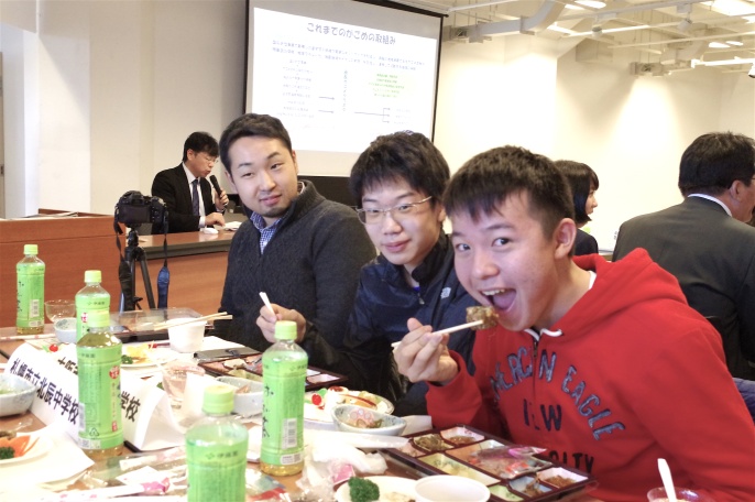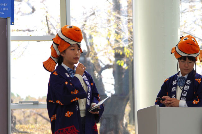 コンテストに先立ち、7月2日から11月13日まで、北海道(函館市、札幌市)、青森県(むつ市)、千葉県(千葉市)、静岡県(静岡市)、大阪府(大阪市)で、海に関連するイベントが開催されました。出場者のなかには、これらのイベントに参加した中高生の姿も見受けられ、イベントで得た知識をもとに、それぞれに独自の視点で作品を制作。また、制服の上から半被を着たり、テーマ作品に絡む魚のかぶり物を身につけたりしてビジュアル効果をねらう参加者もいれば、日本語と英語の2か国語で発表する国際派も。それぞれに個性を発揮して、いずれも甲乙つけがたい熱戦となりました。