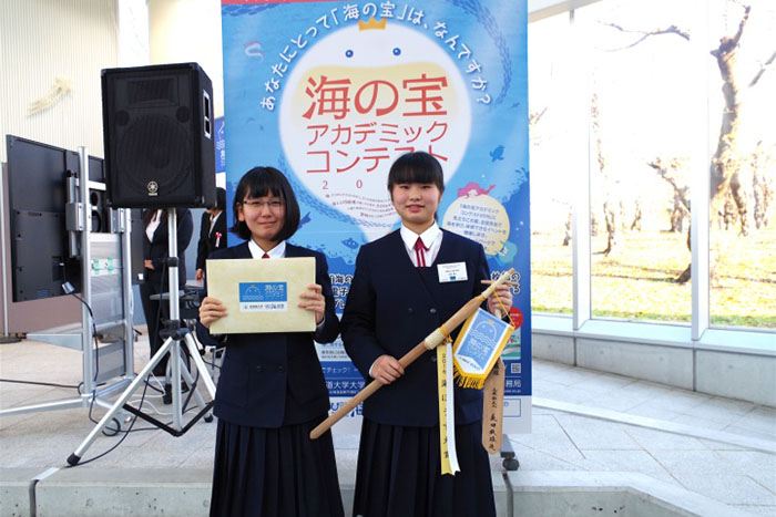 審査では、アピール力、内容、聞き取りやすさ、表現力、質疑に対する応答の様子など5項目に対して評価。安井肇北海道大学水産科学研究院長、海の宝をめぐる学びと体験マリン・ラーニング(海でつながる)プログラム代表・木村暢夫同大教授をはじめとした海のプロフェッショナルによる審査の結果、中学校の部では総合点で高得点を得た札幌市立北辰中学校科学部チーム有孔虫の桂田美礼(かつらだ・みれい)さんと長山ゆい(ながやま・ゆい)さんによる「星砂と北海道〜海の星に魅せられて~」が最優秀作品に与えられる「海ぼうず大賞」を受賞。高等学校の部では、大阪府立市岡高等学校の鎌田菜緒(かまた・なお)さんによる「メガマウスに聴いた海のおはなし〜戦後の日本を支えた海の宝〜」が「海の宝大賞」を受賞しました。