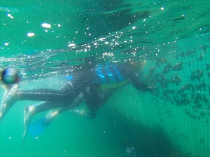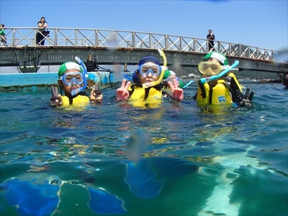 淡島マリンパークのイルカ水槽は海を網で仕切っただけのプールなので、自然そのまま。エントリーやエキジットの時に怪我をする可能性もあります。また、水深も結構あるので足がつかなくてもしっかり泳げることや浮き具で安全を確保しなければなりません。今回は2回スイミングスクールでシュノーケリングの練習をして望みましたが、やはりプールと海は違います。海に慣れるまで時間がかかる子供もいましたので、次回は海での練習も取り入れたいと思っています。