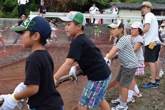 松山市から参加した秋山蒼介君(7)は「イカの卵に触れたよ」と大喜び。母親の都さんは「地引網体験を楽しみにしていました。網を引く大変さも経験させることができてよかったです」と話しました。