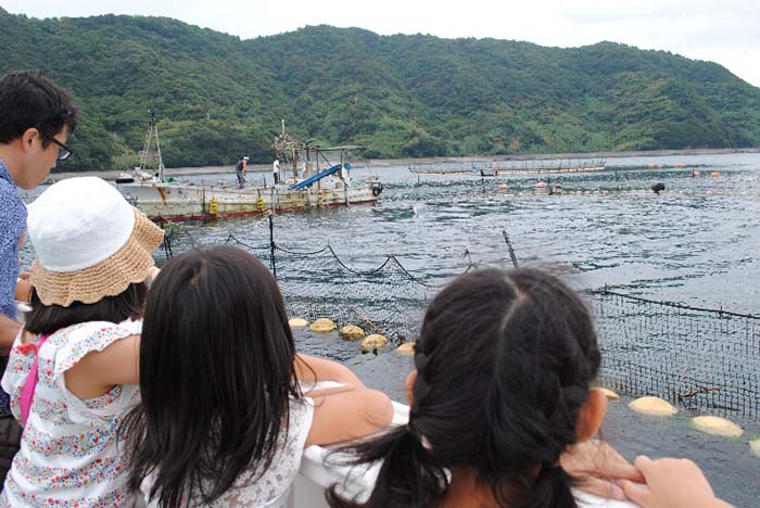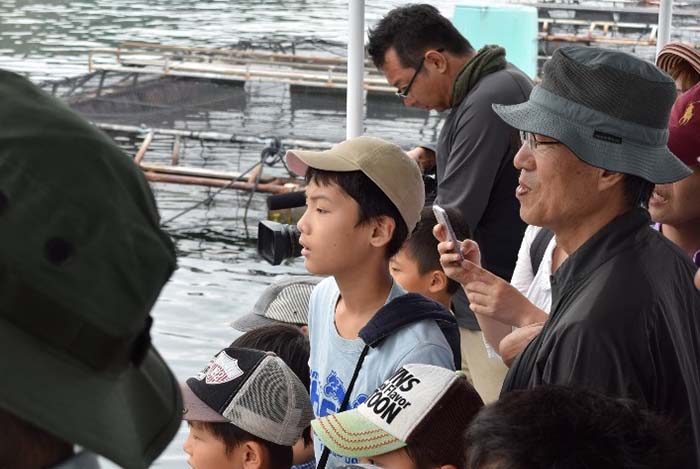いけすに餌の魚が投入されると激しい水しぶきが上がり、「マグロの背びれが見えた!」と目の前でその迫力を体感した子どもたちは大興奮。新居浜市から参加した青木康太朗君(11)は「養殖魚が食べる魚の多さに驚いた」と感想を口にし、母親の佐知子さんは「東予に住んでいるので、南予の水産業に触れるいい機会になりました」と話していました。