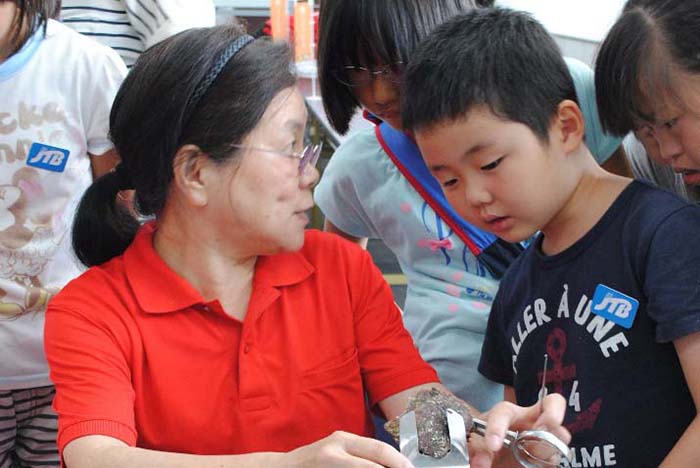市場に隣接しているシーフードセンターでは、入り口に展示していた生のハモに子どもたちは興味津々。松山市から参加した此下幸輝君(9)は「ハモを持ち上げたよ」とうれしそう。父親の耕二さんは「夏休みの課題の新聞づくりのネタ探しに参加しました。普段入れない場所に入ることができ、子どもたちにはいい経験になったと思います」と感想を述べました。