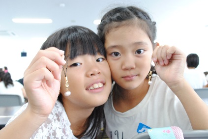 松山市から参加した川井こころちゃん(9)は玉入れ体験に挑戦。「ナイフを使ってちょっと怖かったけど、上手にできて良かった」と充実の笑顔を浮かべ、母親のゆかりさんは「海で働く方々の仕事を見せていただいて、親子で勉強になりました」と話してくれました。伊予市から参加した土居磨夢ちゃん(7)は「真珠のネックレスをつけて、写真を撮ってもらえて嬉しかった」とにっこり。父親の孝範さんは「実際に真珠ができる仕組みを見学・体験できたことがいい経験になったと思います」と振り返りました。