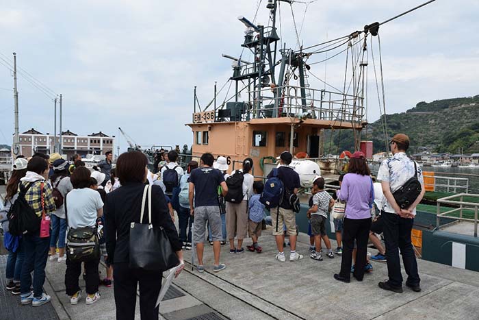 西日本有数のトロール漁業基地として発展してきた八幡浜漁港において、トロール漁業について学び、獲れた業界類がどんな人たちによってどのように食卓に届くかを学びました。八幡浜港に停泊中のトロール船や市営魚市場を見学したほか、冷気漂う製氷室へも入りました。