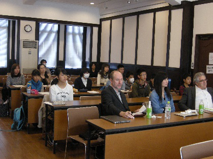 熊谷先生は、琵琶湖が形成された背景には、日本周辺のプレートの動きが関わっており、西からの圧力と東からの圧力で鈴鹿山が上昇し、琵琶湖が沈降したことなどを、図やグラフを使ってわかりやすく説明していただきました。以前熊谷先生のお話を日本語で聞いたことがある中学生も、今回は全て英語での講演ということで、大変集中して、時々メモをとりながら熱心に講演を聞いていらっしゃいました。