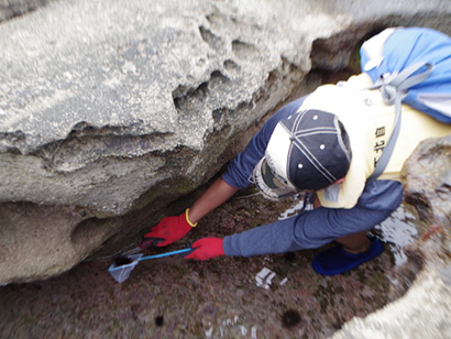 梅雨前線の通過にともない、下北半島は朝方までどしゃぶりの雨。幸いにも一行が海浜調査を始めた9時過ぎには青空に。ちぢり浜の目の前は津軽海峡。この浜は波食棚という広く平坦な岩場で、凝灰岩層や泥岩層、砂岩層からなる地層が露出しています。そして、広々とした灰白色の磯には大小さまざまなタイドプールが点在。これは、砂岩層が浸食作用を受けやすいために形成されたもの。グループごとに調査を行っていた参加者たちは、場所を移しながらタイドプールの縁にしゃがみ込み、「ウニだ〜ッ!」、「カニだ〜ッ!」、「魚がいた〜ッ!」「ホヤのたまごだ〜ッ!」と歓声があちこちから聞こえてきます。