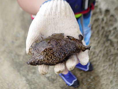 2日目は、待望の海浜調査。同施設から徒歩10分ほどの場所にある「ちぢり浜」で、岩肌や石の下、タイドプール(潮だまり)を観察。さらに、たも網を使って海中のウニやヤドカリ、ウミウシなどをすくい、生き物の感触を体感したほか、コドラートという正方形の枠を使って、海藻・海草がどのくらいの割合で岩肌を被っているか計測しました。
