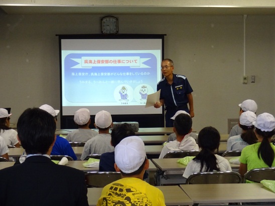 呉海上保安部の事業所では,海上保安部の職員から、海の安全確保や、海上保安部の業務内容,実際に事故にあった場合の対処方法などを学びました。