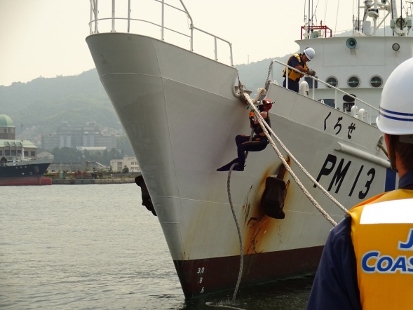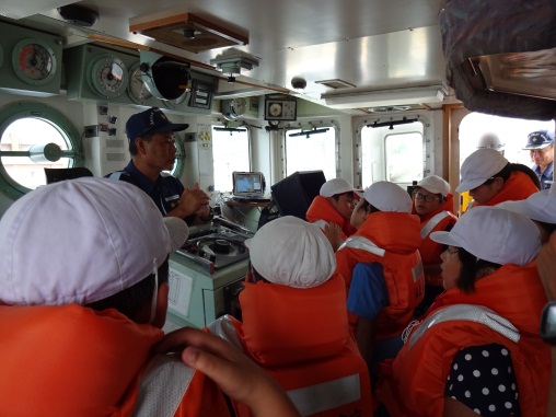 操舵室を見学し、設置してあるいろいろな機械の説明や、手旗信号など船を操作するために何が必要か学んだ後、潜水士から海に潜るのに必要な装備品について詳しい説明を受けました。
