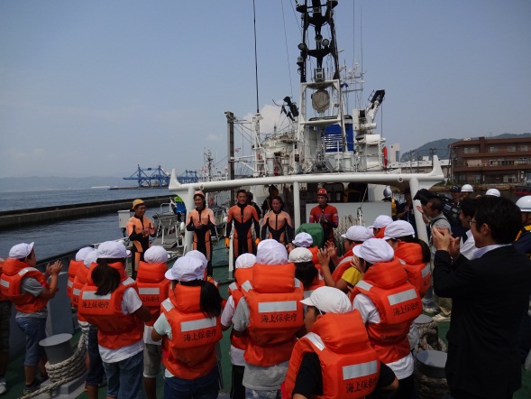 救命胴衣を着用後、屋外の桟橋へ移動し、潜水士の模擬救出訓練や、日頃行っている厳しい訓練を見学しました。子どもたちからは潜水士を応援する「がんばれ!」の声援が多く聞かれました。