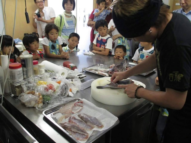 おさかな料理教室は、普段見慣れないおさかなに触れて、調理し、いろんなおさかながいることを学んでもらう事と、自然の恵みに感謝して食すことを学ぶ