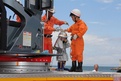 深日港イベントでは、港が防災拠点としての役割を担うことをアピールするため、消防、警察、自衛隊の皆さんに参加いただき、防災啓発も実施しています。子どもたちは、防火服を着用したレスキュー体験や30mはしご車への搭乗、災害時に活躍する自衛隊車両に乗車するなどの防災体験をしました。