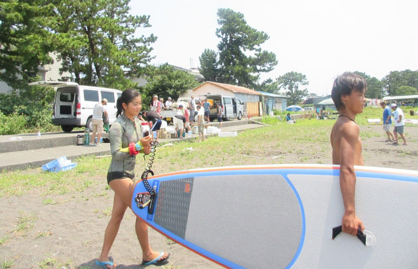 レース観戦者や海水浴客がパドルボードを体験。なかには競技に参加するため、御前崎からやってきた中学2年と3年のウインドサーファーの少年少女も!?