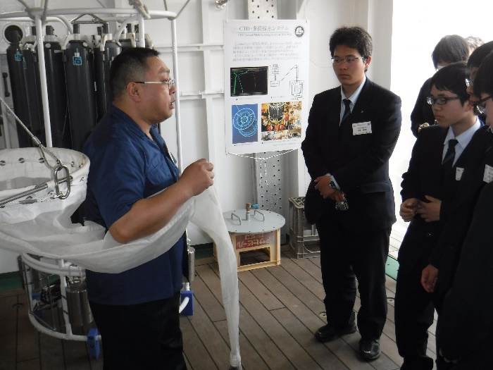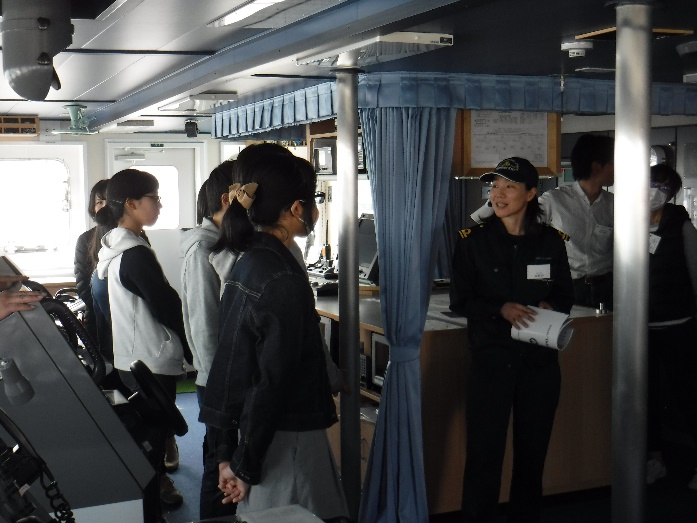 研究室・採水器室では、北海道大学水産学部の研究で実際に使われているCTD(Conductivity・Temperature・Depth)観測装置、ニスキン採水器、プランクトンネットなどの実物が展示され、手に触れながら説明を受けました。船橋区画では大和田次席二等航海士より操舵機・エンジンコントロール機器・レーダー機器・電子チャートなどの説明が行われました。