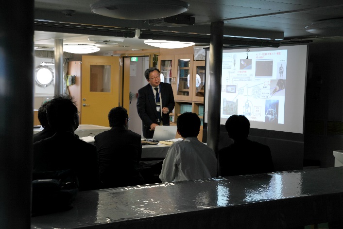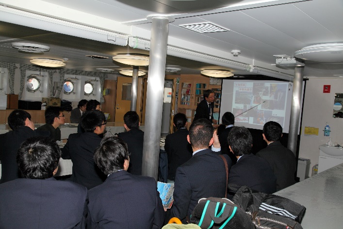 埠頭に集まって頂いた参加者を、参加者リストを確認しながら、船内の学生食堂・講義室に誘導し、全員の集合と着席を確認後、高木省吾(たかぎ・しょうご)船長から歓迎の挨拶があり、「おしょろ丸」の名前の由来など簡単な紹介が成されました。次いで、本日のプロジェクトに係る担当船員・担当教員の自己紹介の後、大和田真紀(おおわだ・まき)次席二等航海士から船内を見学する上での諸注意が行われました。その後、見学者は二班に分かれて船内見学・ミニレクチャーを交互に実施しました。