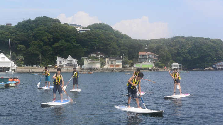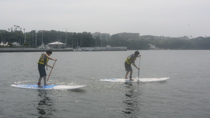 スタンドアップパドルボードは、サーフィンのボードを浮力を強くして人間が立てるようにしたボードです。バランスを保つのが難しいアクティビティですが、スタッフの指導で上手に乗りこなすことができました。