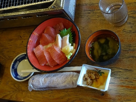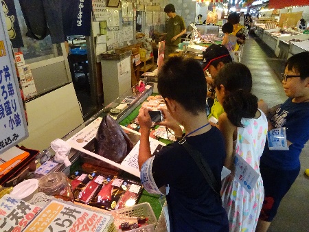 静岡市の海の玄関口である清水魚市場の併設される商業施設河岸の市内の馬鹿貝にてマグロ丼を食べてもらいました。また、そのあと班ごとに河岸の市内を自由見学してもらい、普段あまり触れる機会の少ない静岡で水揚げされた生鮮食品の見学などを行いました。