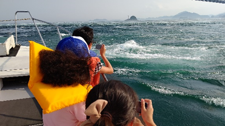 内容:橋の主塔よりも間近で渦潮を体感することで渦潮の潮の力を実感させる。チャーター船でエンジン切って潮流の強さを体感する。渦潮の力強さを体感させる。